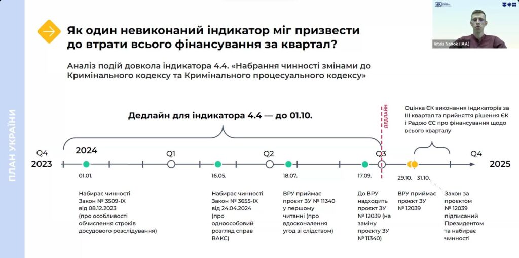 “Це перший випадок, коли ми вчасно не виконали один з індикаторів Плану України. Мова про необхідність набрання чинності змінами до Кримінального кодексу та Кримінального процесуального кодексу. Незважаючи на невчасне виконання індикатора, в ЄС повідомив, що вчергове піде нам на зустріч та виплатить повну суму за індикатори третього кварталу, у разі набрання чинності законом №12039 до кінця жовтня. Власне так і сталось: по обіді (31 жовтня) закон був підписаний Президентом України”, – зауважив Віталій Набок.