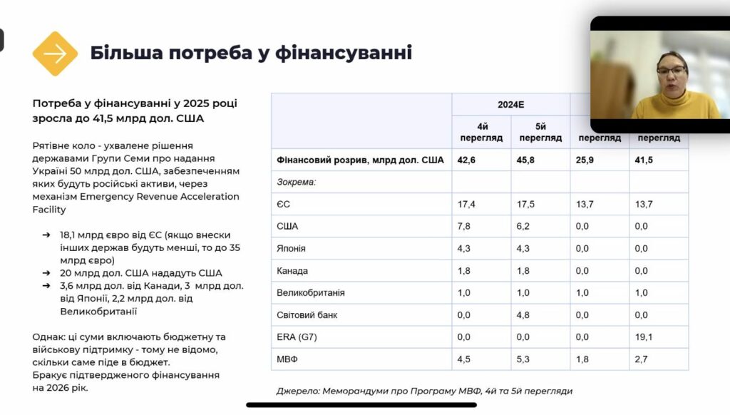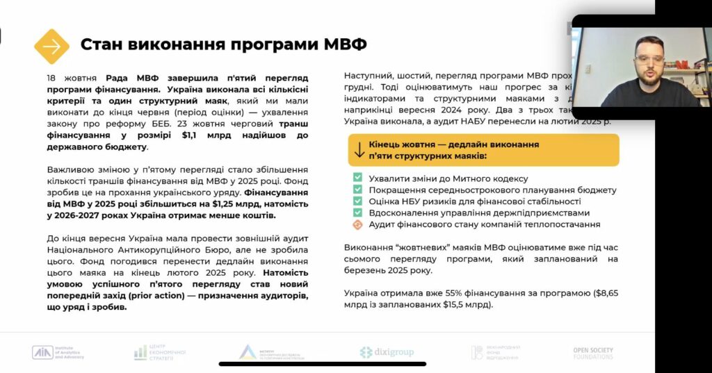 Також, в жовтні Виконавча Рада МВФ ухвалила 5-й перегляд програми МВФ, що, на думку експертки, пояснюється одразу двома факторами: потребою нашої держави у фінансуванні, яке є стимулом вчасно виконувати зобов’язання, та гнучкістю МВФ. Крім цього, було переглянуто макроекономічний прогноз, який тепер ґрунтується на припущенні про тривалість бойових дій протягом всього 2025 року.